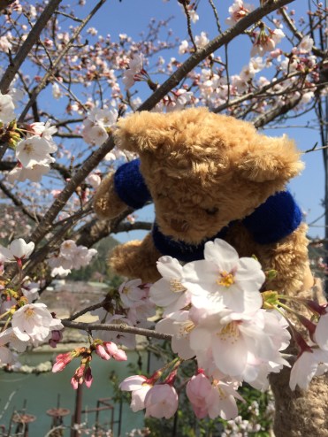 這天是旅途第一次近距離遇上櫻花,所以小熊也忍不住要爬上去 XD