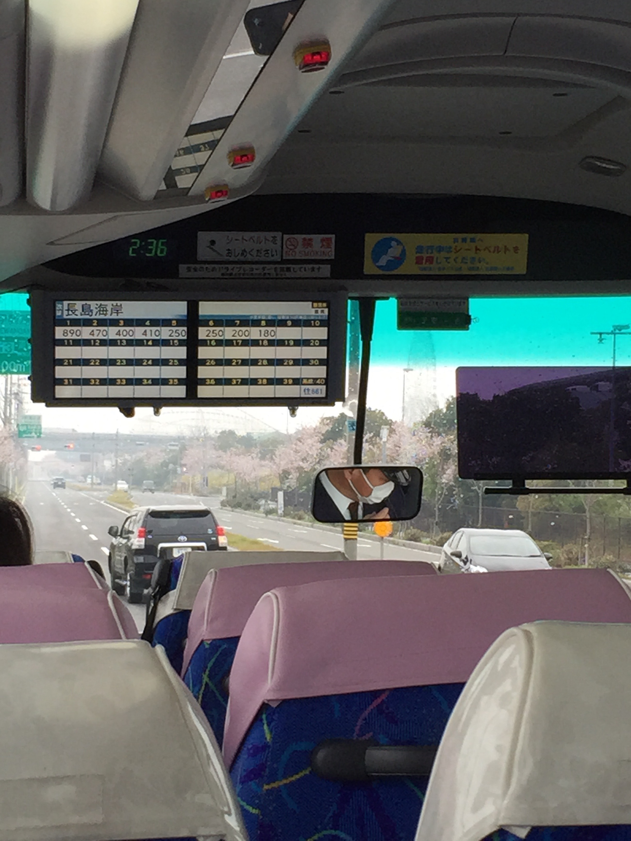 那是往鄉郊地區的方向。偶爾會停站,然後有一個半個打扮樸素的居民上落車。當窗外的櫻花拍得差不多的時候,我們的注意力就落在前方司機位旁邊的顯示屏上面。「長島海岸」無疑是下一站的名稱,但下面的890、470又是甚麼回事呢?數字串會愈來愈長,全部的數值也會愈來愈大──其實是下站下車時要給的車資。中途上車的人不買票,是在下車時才付錢。從第1個站上車,現在下車就是890日圓;剛才在第8個站上車現在就下車的話就是180日圓。算是按距離付費,對於短途乘客來說比較划算。