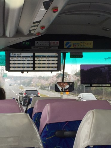 候車處在4樓,已經有幾個日本人在等了。司機準時駛著巴士來到,沒有查票就讓我們上車,相信是本來這個地方就沒甚麼人去,大概每次都是只有幾個人。30座位巴士上的乘客十隻手指數得完。去程巴士在下午是每小時2班,運行時間是上午8時至下午6時;回程巴士的頻率也是差不多,尾班車則是晚上8時50分。這種巴士時間表對於香港人來說是不可思議吧。晚上8時,平日我們才剛開始跟朋友等位食飯,這裏就已經是準備關門的時間了。