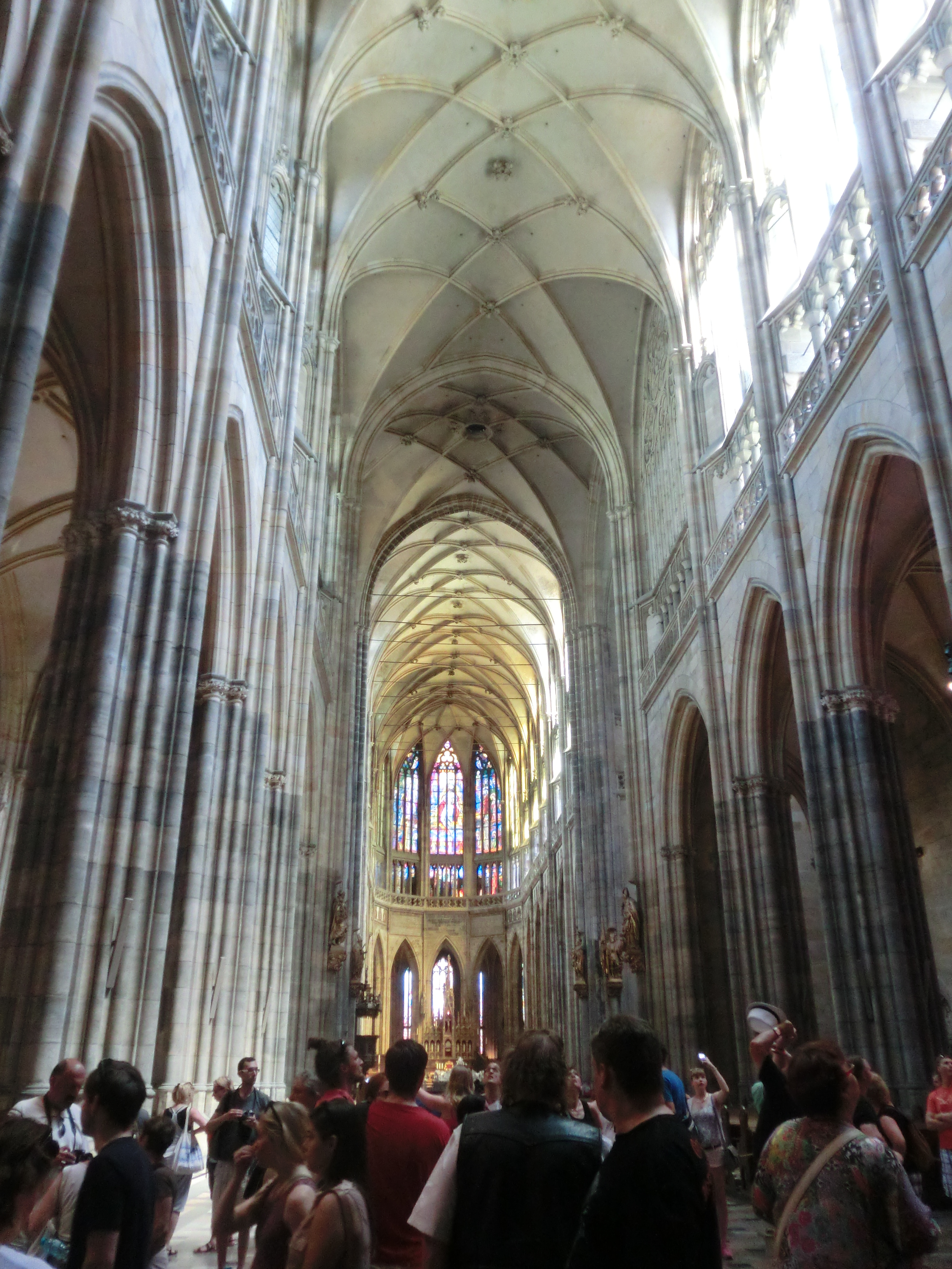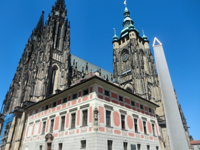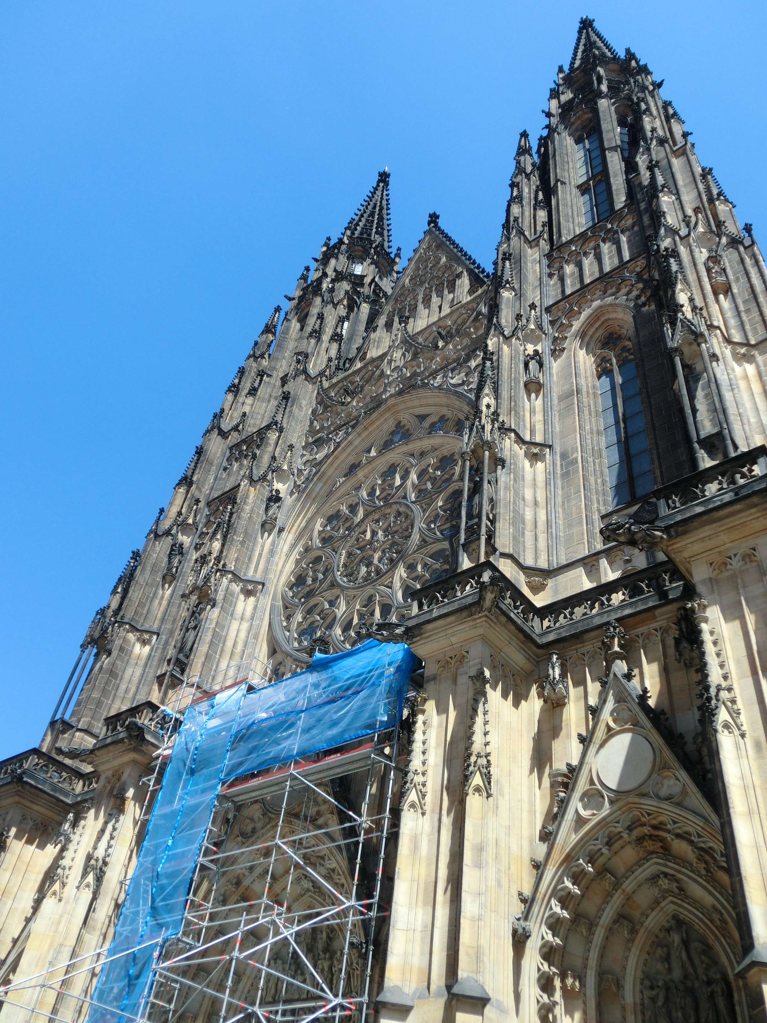 這座教堂號稱是捷克最大及最重要的教堂,用現代的眼光來看它也是一個拖延得幾近「爛尾」的建築計劃──由1344年查理四世下令要興建,到1929年才完工,歷時近乎600年。但這個跨越幾個世紀的建築並沒有違和感。最初的定調就是哥德式教堂,初代建築師死後由同時建造查理大橋的建築師Peter Parler接手,而最初幾代建築師都有把這個風格延續下去,直到15世紀波希米亞戰爭(捷克歷史很重要的一部份,但是不太了解)後,工程先後因為戰火和資金不足而停擺,途中有加入一些巴洛克的建築特色,到了19世紀才重新開始教堂的修復和建築工程,基本回復了Peter Parler的設計。所以一座哥德式的教堂才會在20世紀落成。