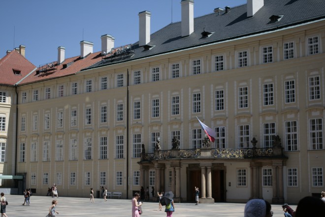 走過去才發現那真是舊皇宮。基本上走完這個部份我是熱到腦到糊掉了,只記得一件事──捷克人很喜歡把人拋出窗外。Defenestration,意思就是throwing someone out of the window,來源是拉丁文,fenestra就是窗戶的意思。固然捷克不是唯一一個會把人拋出窗外的國家,但拋到寫入歷史也應該是絕無僅有。在捷克史上發生過兩次有名的Defenestration事件,第二次正正就是在布拉格城堡發生。在1618年因為宗教原因把人從布拉格城堡的窗台推下去,最終引發了歐洲的三十年戰爭。那個,我們看到那些城堡裏的那些窗台,大概可以把人橫著拋下去。