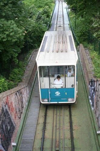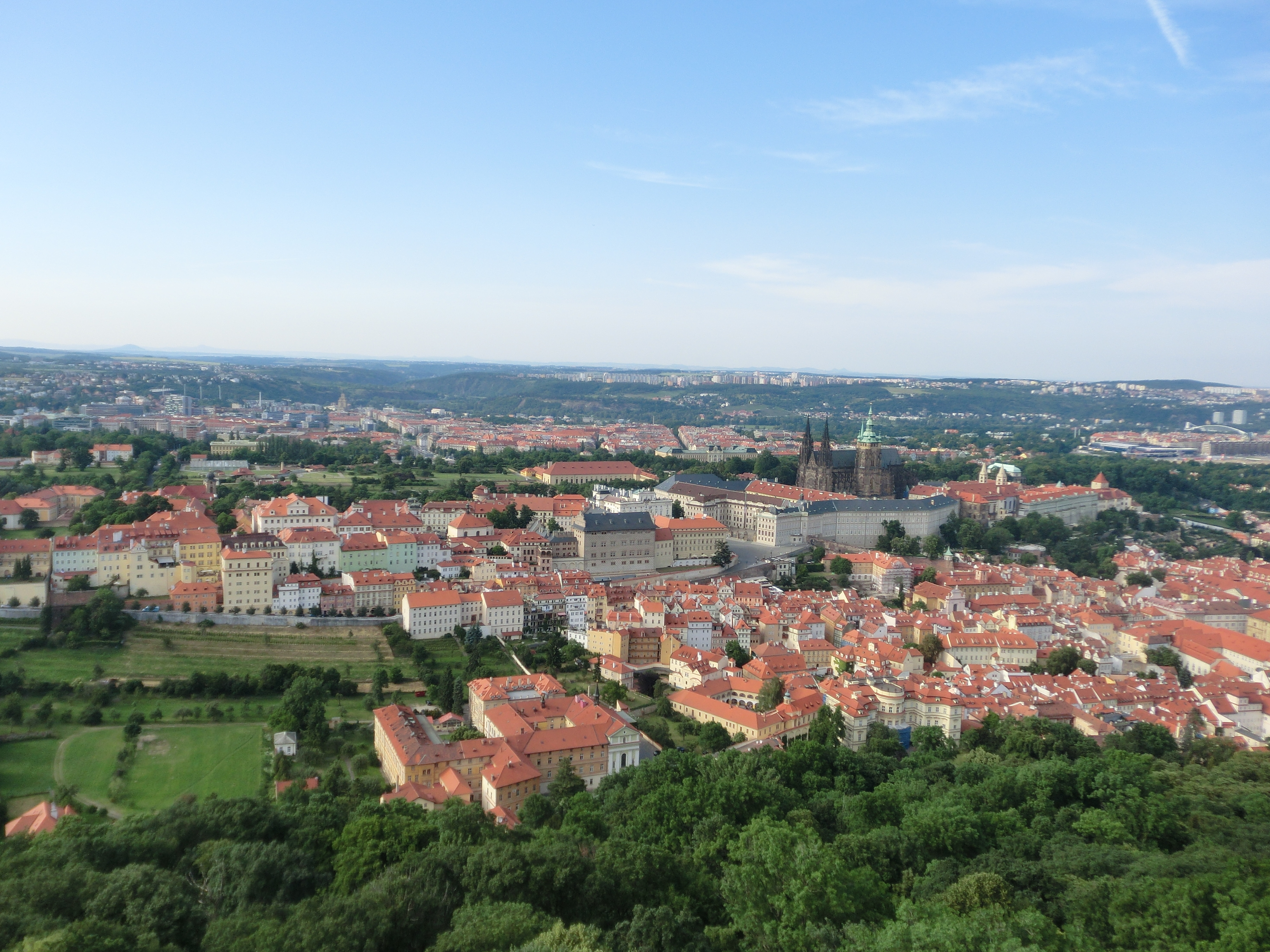 在查理大橋上可以看到河的對岸,那就是Petřín Hill。有說也是個看日落的景點,但我們反而是在中午的時候去。本來有打算過買些甚麼東西野餐的,不過因為我病得七葷八素,還是隨便走走吃吃算了。基本上Petřín Hill就是一個小山坡──山頂只有海拔327米高,連香港太平山都有552米,這還不算是小矮人嗎?最為遊客喜愛的登山方法是從Újezd乘登山纜車,纜車只有企位,基本上就是只有扶手和一排排的欄杆。