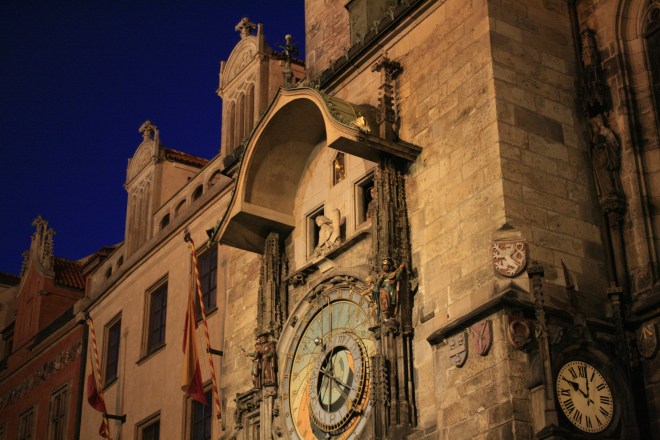 這個天文鐘說起來還新好笑。因為是在舊城區一個很有名的景點,而且叫做「天文鐘」也叫人聯想到星空甚麼的,應該會很漂亮吧?呃,我不知道。或者在1490年建成時,天文鐘兼具創新科技和宗教之美。天文鐘的結構非常複雜,應該說是精緻sophisticated:鐘盤用藍色、橙色和黑色底色分別表示白天、黎明/黃昏和黑夜;羅馬數字代表的是12小時制的時間,太陽指針表示小時,星星指針表示分鐘;最外圍的24個數字代表的是古捷克的時間,也是用太陽指針表示;而「太陽」和「月球」所在就的星座符號自然就是代表當時它們各自落在黃道十二宮的哪一宮,這個黃道環是可以移動的。有說那個「月球」甚至能反映出圓缺,不過太遠看不到。