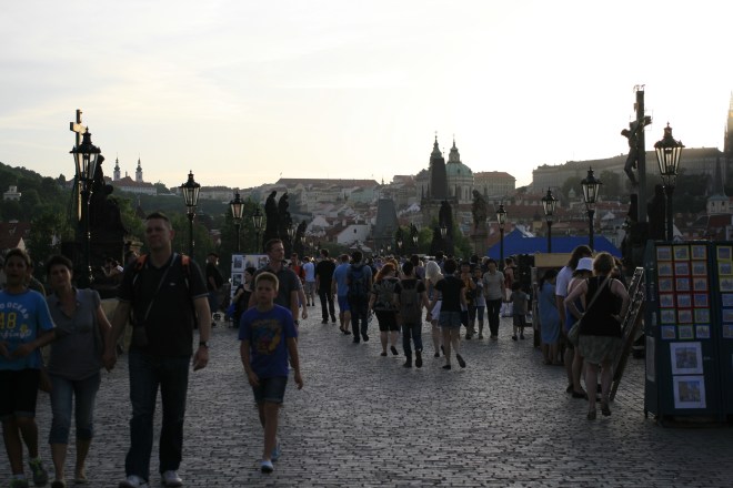 查理大橋則是看日落的最佳地點。橋上有些人在寫生,有些人在賣紀念品。大家都是懶懶閒那種等待太陽落到地平線下。話說回來,這又是哪個查理呢?如果你的歷史知識沒有全數還給中學老師的話,你應該會記得Holy Roman Empire「神聖羅馬帝國」,這裡說的「查理」就是神聖羅馬帝國的查理四世。他的父親是波希米亞國王(波希米亞國的領土範圍大概是現捷克共和國中西部地區,包括布拉格在內),母親則是在布拉格出生與成長,查理四世登基後著意提升波布米亞的地位,又在布拉格建設大橋、學校。