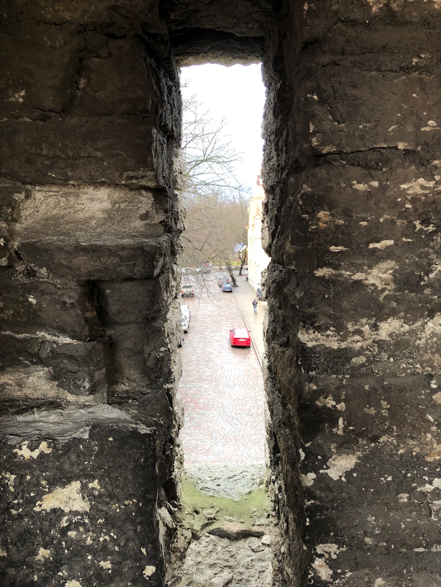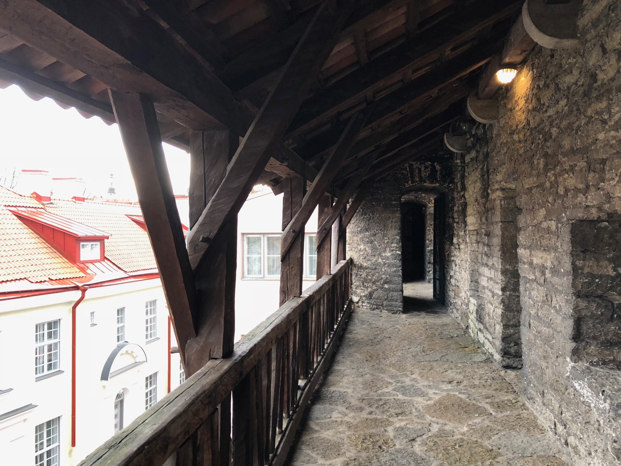 中間不可缺少的當然是城牆部份。塔林版本並不像是萬里長城那種露天的,而是頭頂有木造的簷蓬。這條通道,左邊的木柱之間是內城區的景觀,右邊的石牆上則有狹長的石洞可以望向城外。