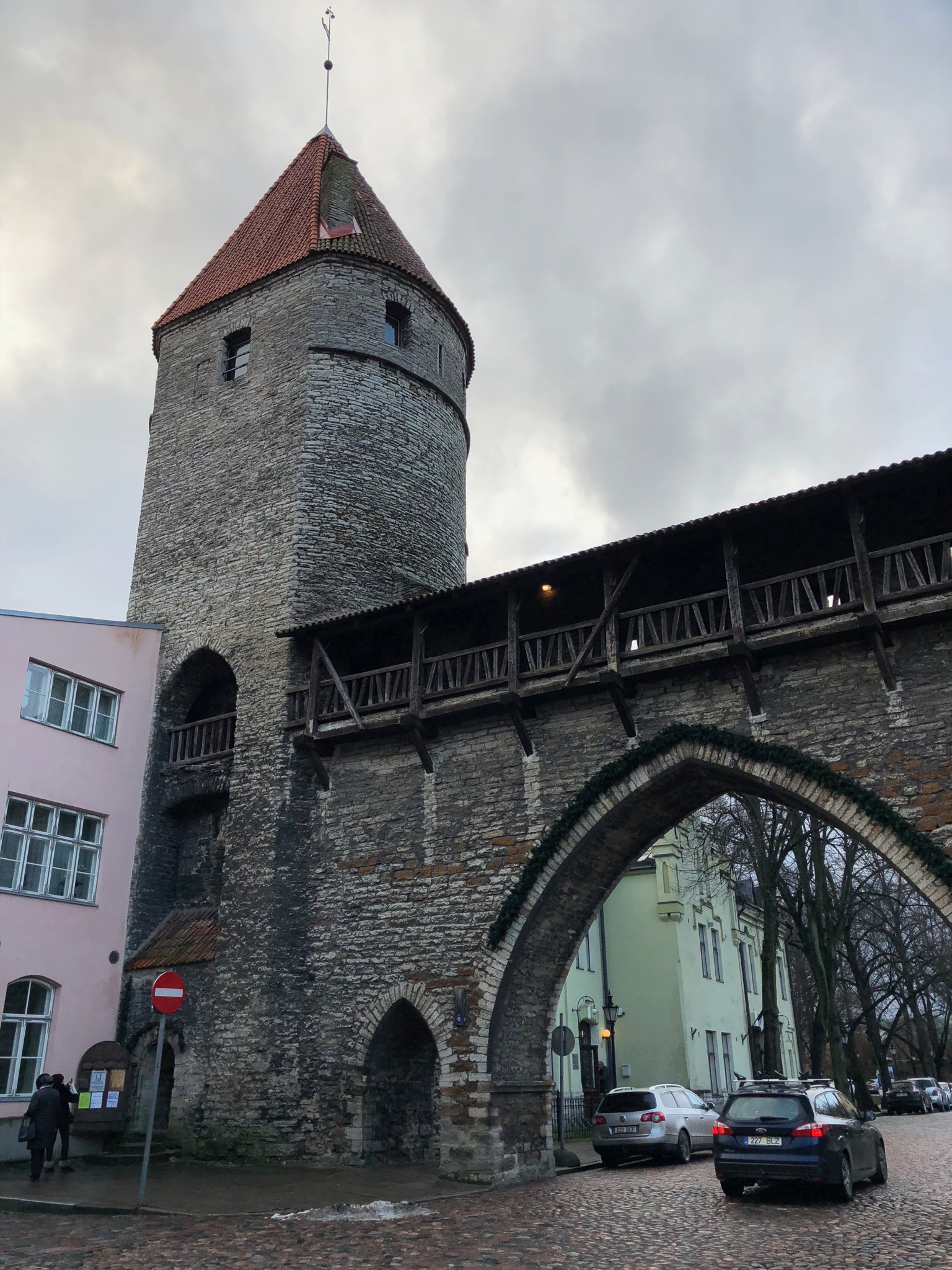 塔林舊城區的房子,最高也只是3、4層,白色的扁平窗戶排列得非常整齊,配著粉色系的牆壁,偏生出「建築物正在互相擠迫」的魔幻感,好像甚麼東西要在小房子之間擠生出來。那是甚麼呢?然後我們就看到了,正是塔樓。名為「Pika Jala Väravatorn」的塔樓,從兩矮小房子之間拔地而起,窗戶開得窄小又排列得零落,頭上的橙色尖頂帽更添怪異感。看它怪異得可愛,便從底下的拱門穿過去。