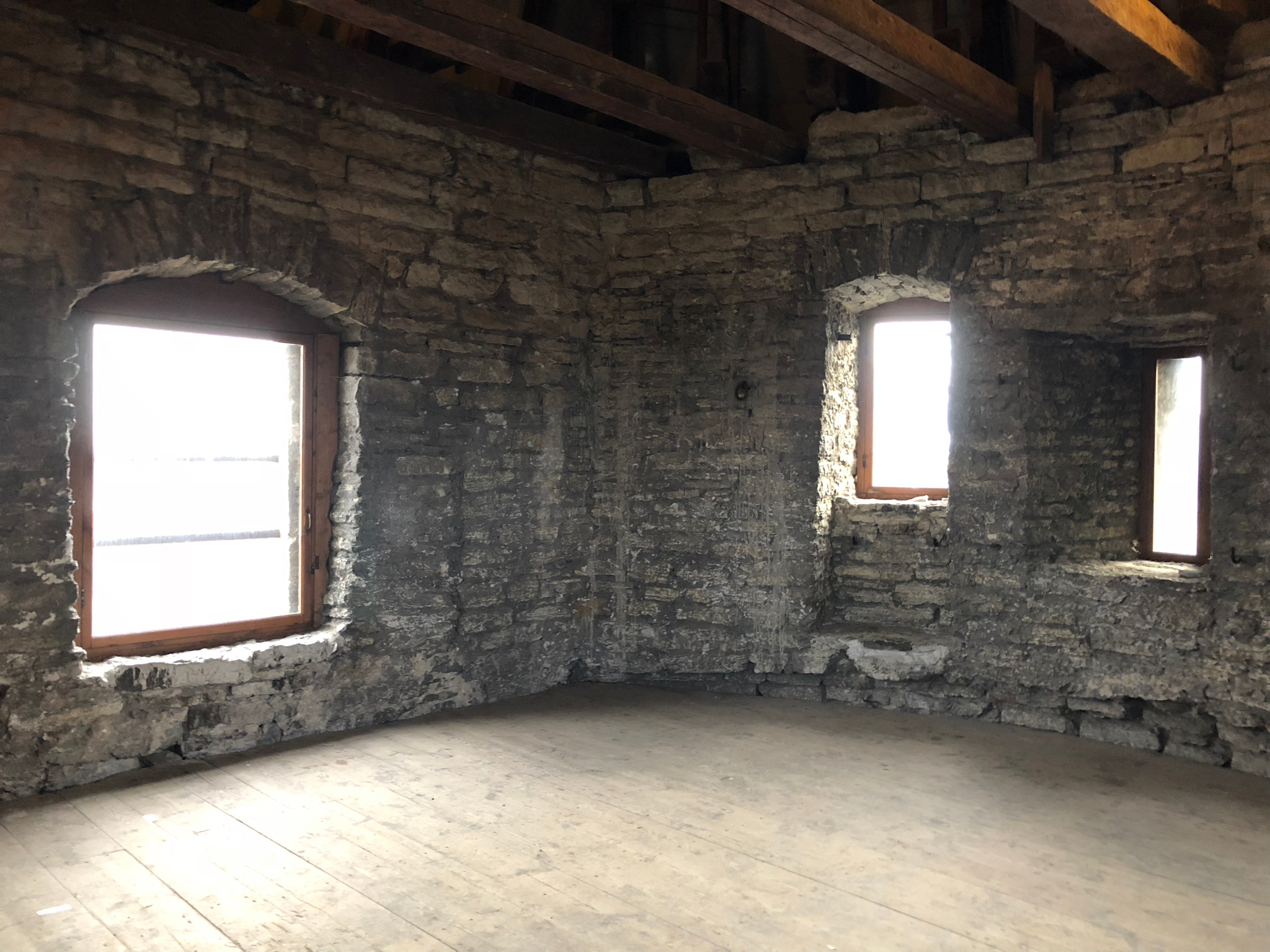 塔樓最頂部份的石階最窄,也沒有鐵扶手,只有牆上掛著的鐵鍊給人扶著。登上塔樓最高處才發現,在這裡也不能俯瞰整個舊城區,因為塔樓比其他建築物沒有明顯地高出很多。而且說實話,城牆和塔樓的外觀比內在吸引。然而,相對於教堂、廣場等等那些舊城區的基本配備,塔林的城牆和塔樓卻是新鮮得多。