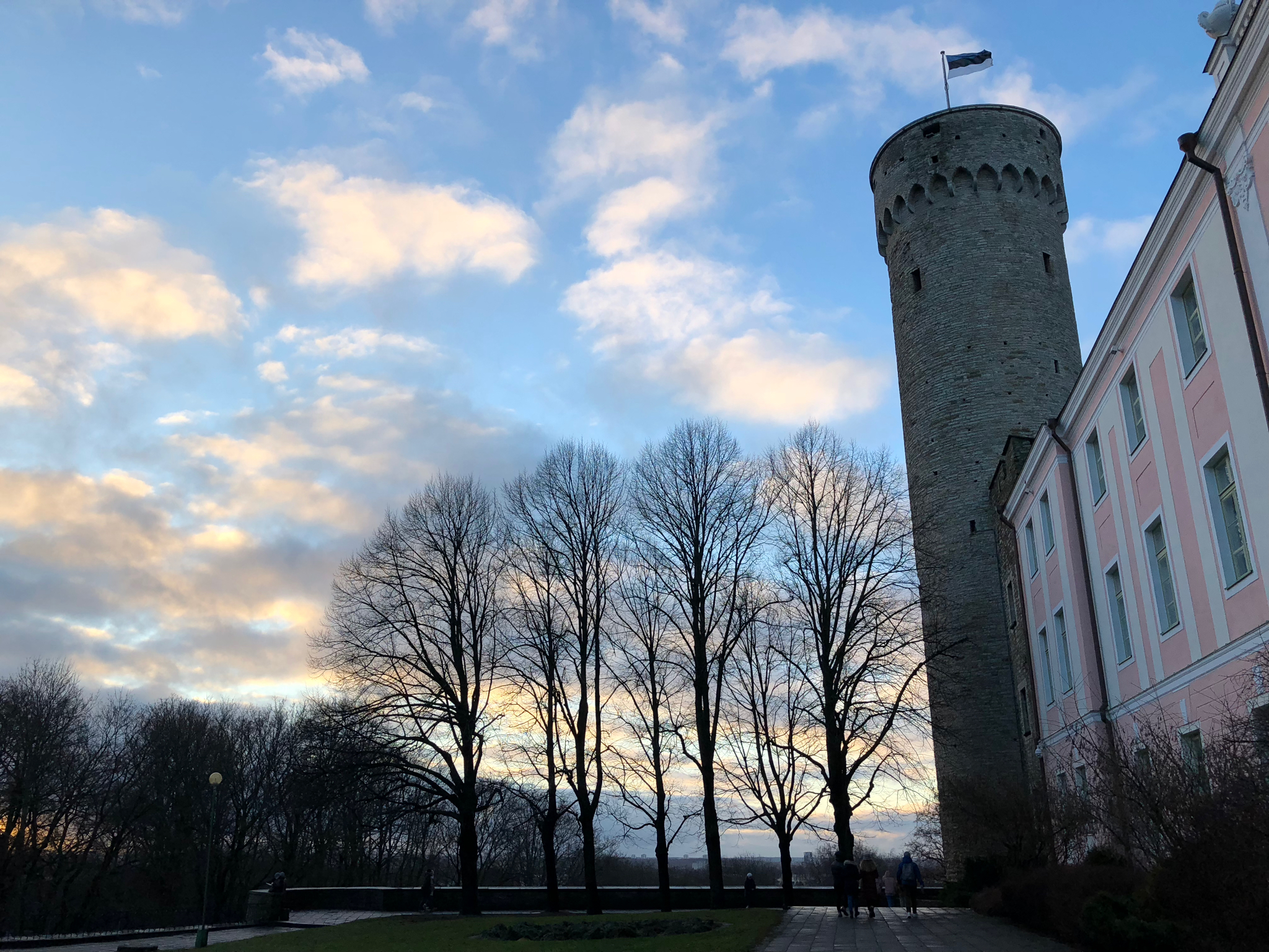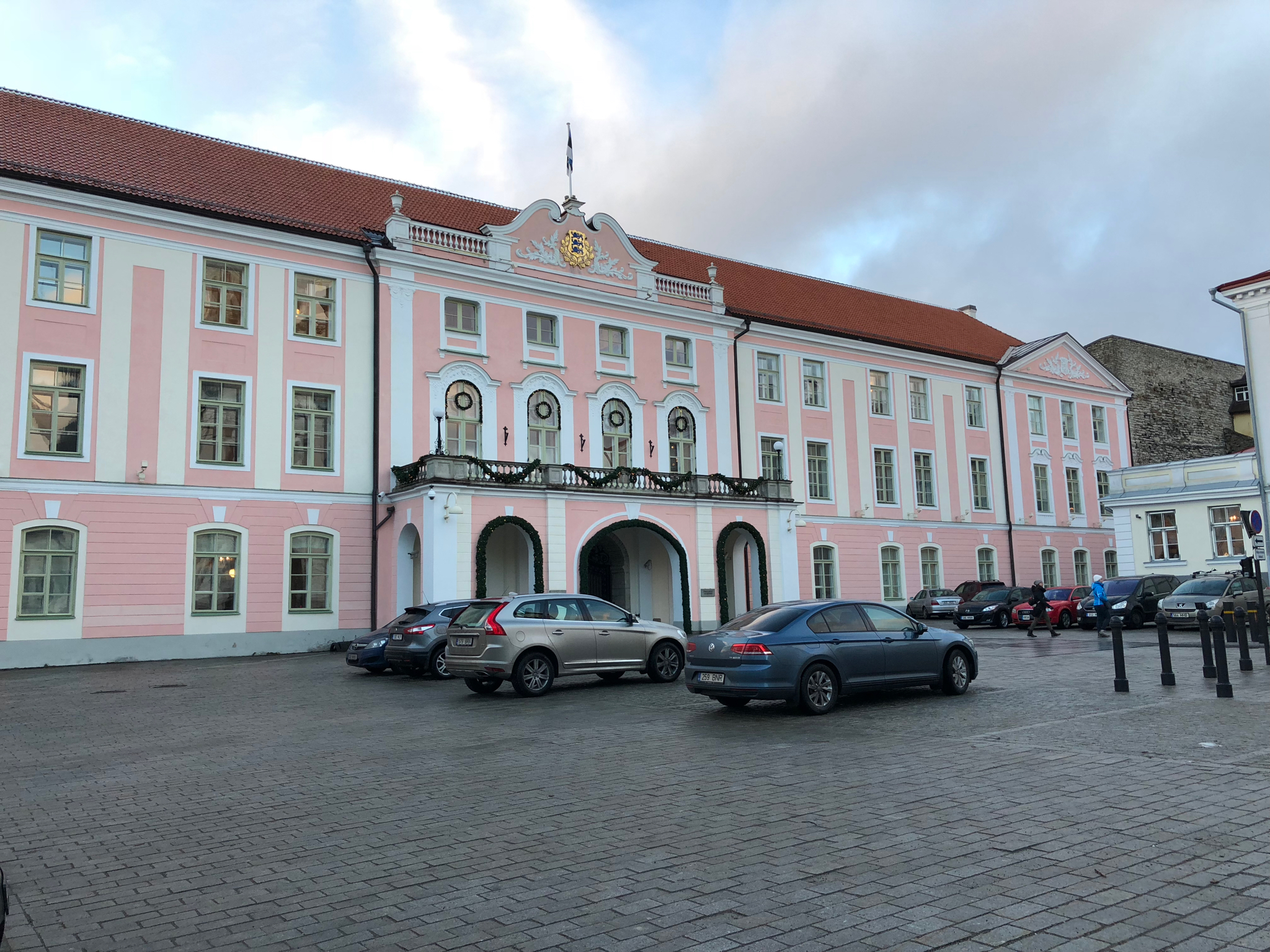 平常所見的城堡都是石牆圍著,可能有幾座塔樓,感覺相當威嚴甚麼的。這個粉紅色外牆、看似是一路上的小房子的放大版的建築物,沒想到竟然是座堂山城堡Toompea Loss(Toompea Castle)。當時我還覺得奇怪,怎麼粉紅色房子的角落生出一棟瞭望塔──原來那是赫爾曼塔Pikk Hermann(Hermann Tower),傳統是塔上必然會懸掛著統治政權的國旗。有眼不識泰山,巨形粉紅色房子原來落成已有800年,曾被不同時期統治愛沙尼亞的政權進駐,現今被愛沙尼亞的國會Riigikogu徵用。從山下看過來會見到比較中世紀的一面,即是灰色的石牆和赫爾曼塔等,在兩個角度有兩種如此不同的面貌,很有趣。