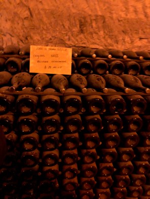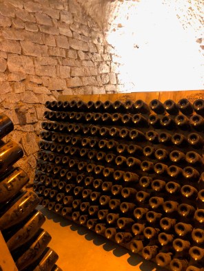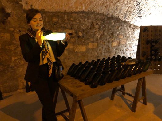 酒窖內部導覽員沒有多介紹,看起來是地底石洞。她帶我們來到一個石室,設有一排排呈「A」字豎立的木板,上面斜插滿酒瓶。這是來示範Veuve Clicquot另一項成就:發明了移除酒瓶內的酵母的方法,「轉瓶(riddling)」──簡單來說,是透過定期改變瓶子向下傾斜的角度和轉動瓶子,讓酵母積累在瓶口,方便讓它們流出來。當時香檳酒商的方法是將釀成的酒轉移到新瓶,但亦會令氣泡在過程中流失;而這個新方法讓香檳口味更佳,而且方便大量生產。