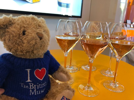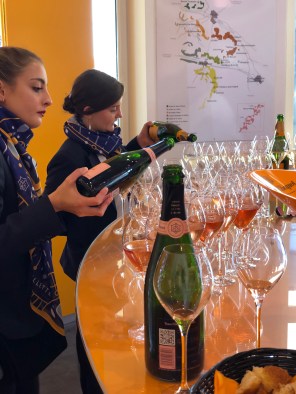 我們的導覽團可以每人飲到Non-vintage白中白和玫瑰香檳各一杯。如果想要額外試飲其他種類的香檳,就需要另外付費。她們在吧檯上放了所有玻璃杯,一次過斟了兩種香檳,然後說:「我們建議你們現在就把自己的兩杯香檳拿在手上。如果你飲完一杯再來,可能就會發現被別人飲了!」然後導覽員就走開了。