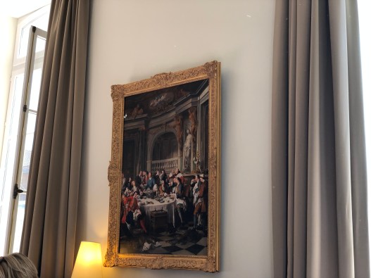 而等待室就在走廊另一邊。房間鋪上柔軟的地氈,三排淺色沙發呈「U型」擺放,中間有一張大玻璃茶几,牆上還掛了與香檳有關的油畫,感覺不是等著參觀酒莊而是城堡之類的。印象中大概10人左右,參加者就各自在沙發落座,小團體之間有足夠空間,不會有跟陌生人擠在一起的尷尬。