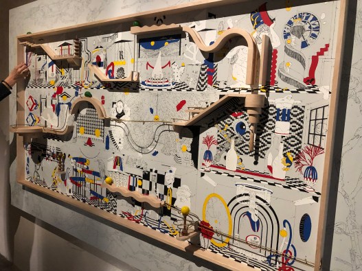 我們首先看的第一件展品,是藝術品。臨近往下走去酒窖之前,置了一張長枱,用玻璃製品模擬了杯盤狼藉的桌面,還有彷彿跌了下來的吊燈。導覽員表示慧納酒莊與藝術界淵源甚深,與不同藝術家有合作,又會支持藝術展覽等等。連之後介紹香檳製作過程也使用裝置藝術──她把一個木球放進去,在它順著軌跡滑動的時候,她同時講解「走過」甚麼釀酒步驟;當木球離開「生產線」的時候,她的解說亦同時結束。可以看到這個酒莊的定位如何。