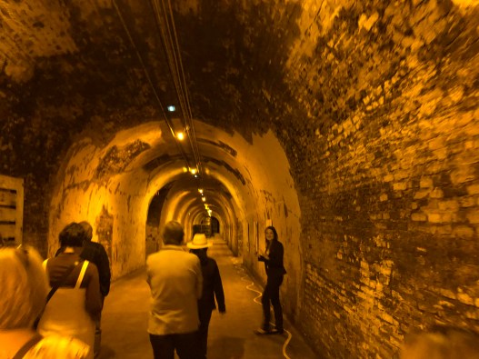 我們再往下走,來到非常寬闊的石室,彷彿教堂一樣樓底很高,而且最頂端還開了一個洞口。這是甚麼地方呢?原來我們已經來到地底38米。慧納酒莊酒窖使用的地方,「是crayère」,導覽員說。明明一直都用非常流利無法國口音的英語在介紹,突然之間跑出這個法語詞語是甚麼意思呢?crayère(chalk quarry)是石灰礦場,這個地底網絡的出現是因為羅馬人統治時期他們在這裡采石灰。因此酒莊所在的街道名為Rue des Crayères(石灰礦場街?),而巴士站亦為Crayères。