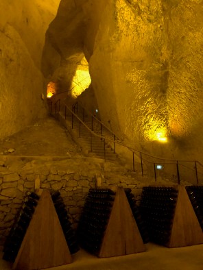 這個石灰礦場在中世紀時有商人用作貨倉,上面的洞是為了把貨物釣上去的。到了18世紀中期,Ruinart家族將這一整片土地都買下來,看中的就是這個長達8公里的地底礦場,因為該處大持維持清涼和穩定濕度,適合釀酒。