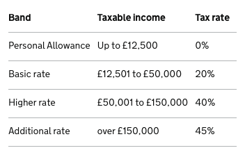 個人免稅額(Personal Allowance)為£12,500,即是年收入在此之下的不用交入息稅,而超過的話則按下圖的比例計算: