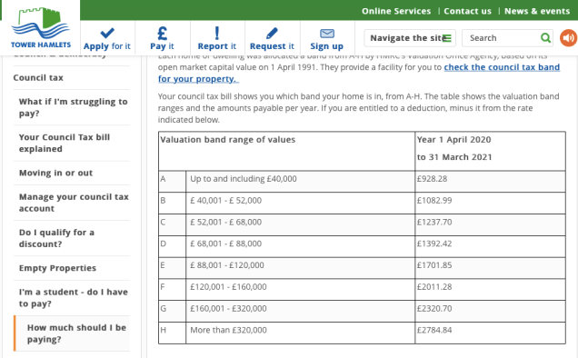 知道自己心目中想住的房屋在屬於哪一個估值組別和哪一個分區議會後,就可以直接去該分區議會網頁看所需議會稅是多少。以Denison House的住戶來說,2020/21的議會稅可能分別是£1392.42 (Band D)、£1701.85 (Band E)、£2011.28 (Band F)。Greenwich則更貴。