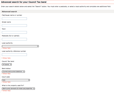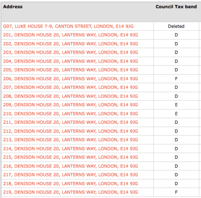 他預設是用郵遞編號(postcode)作搜尋的,租屋網站通常都會顯示。亦可以選Advanced search,如果知道街道名和地方政府(Local Authority)的話--地方政府的選項是按照borough的,所以這個清單的London是指City of London那一小塊。繼續以Denison House為例,估值組別由D至F都有。