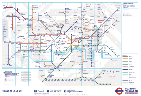 住在倫敦而又不常駕駛(甚至沒有車的話)就不得不留意倫敦地鐵(tube)。從鐵路圖可見,倫敦分成zone 1 – 9,zone 1是市中心亦包括大部分遊客會前往的地點,zone 2-9是以zone 1為中心再逐一擴展出去,因此zone的數字愈大距離市中心愈遠。(可放大的PDF版鐵路圖在這裡)