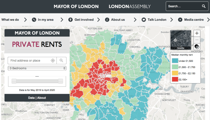 倫敦市政府設有互動地圖,數據來自每個郵政地區(postcode area)過去12個月的租金,每季更新一次。假設你想住SE10的兩房單位,你可以直接看到該郵政地區的、該borough的和倫敦的中位數。