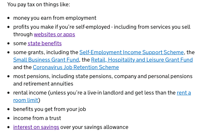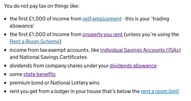 英國的入息稅制對受僱人士來說並不複雜--如果你沒有儲蓄利息(interest on saving)、股息(dividend)、退休金(pension)的話。其政府網頁說並非所有收入都要納稅,詳見如下: